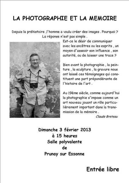 Conférence de Claude Breteau Dimanche 3 février 2013 à 15 heuresSalle polyvalente de Prunay sur Essonne La photographie et la mémoire