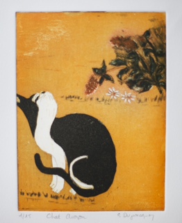 Elle travaille la taille douce sur cuivre en privilégiant l'aquatinte qui lui offre subtilités et surprises.
