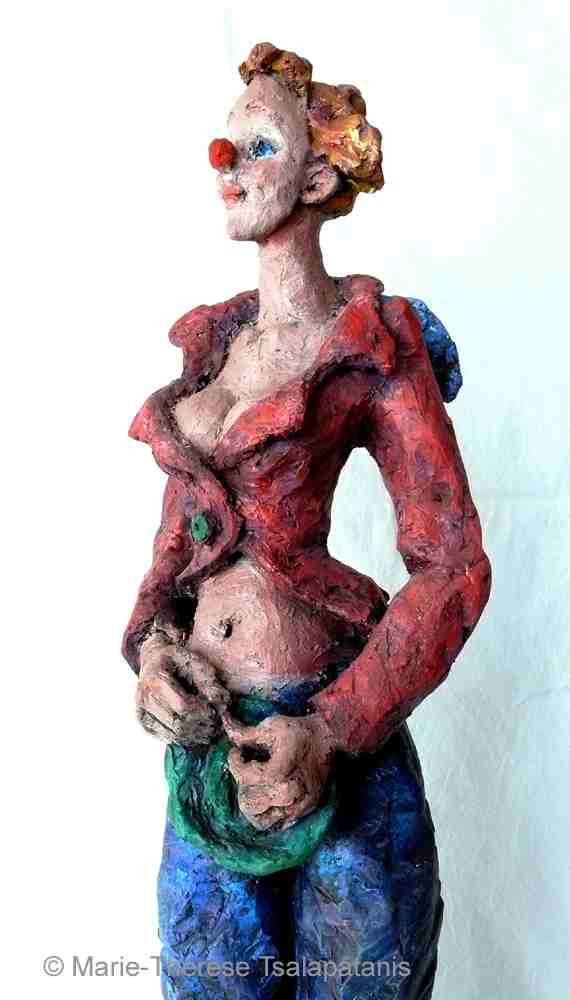"Ainsi point d’Eve à la Pomme, ou de féminité famélique sacrifiée sur l’autel de la Misogynie. Tout au contraire, la Sculpture de Marie-Thérèse Tsalapatanis joue d’une opulence presque exotique - plus assurément atemporelle- qui fait de l’acte de sculpter une nécessité revendiquée et presque militante, hommage aux gens de peu, aux clowneries d’un Monde en représentation, dont on tente de sublimer les excès."