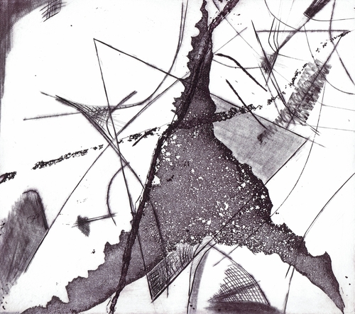 Frontières, mitoyennetés : Territoires, plans imaginaires, les lignes, les aplats, se rencontrent, s'entrechoquent, se lient. Les paysages naissent, ce sont autant d'espaces bordés par des frontières, ou des mitoyennetés. Sur le métal le copeau s'efface, laisse une trace. Il inscrit à la fois, le réservoir où l'encre, s'infiltre. La "rigole" sera ligne. De la même manière la morsure de l'acide laissera ses traces graduées, elles seront : tracés, domaines, espaces. L'impression magie est estampe.