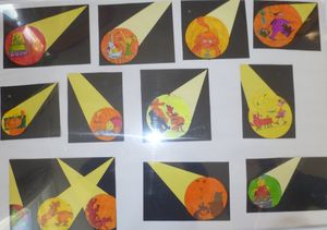 Il s’agissait de faire apparaître le chat dans un rond de lumière au fil de l’histoire, de le mettre en scène, comme pour un spectacle. Le thème du chat, et plus largement celui des félins a été choisi par l’ensemble des classes du cycle 2.C’est pourquoi d’autres œuvres de l’école présenteront des félins également.