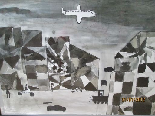 Pour représenter la ville, nous avons fait des tableaux collectifs en couleurs et en noir et blanc avec des encres. Nous avons représenté les bâtiments avec des formes géométriques, puis nous avons collé des silhouettes de personnages, d’animaux et de véhicules.