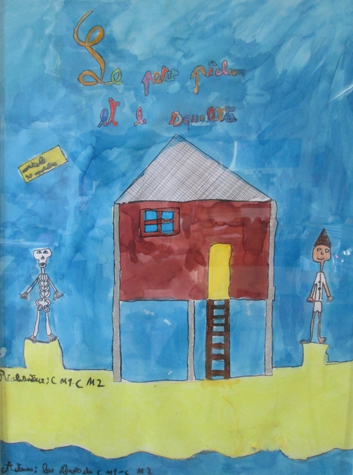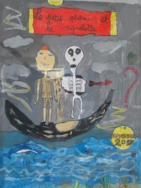 Texte écrit par deux jeunes élèves :Nous avons fait des affiches du « kamishibaï » (le petit pêcheur et le squelette) parce que nous avons beaucoup étudié l’histoire. Nous connaissons très bien surtout le texte. Ca nous a donné l’occasion d’étudier les affiches de cinéma.